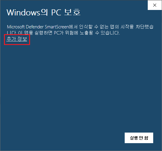 - Windows의 PC 보호: Microsoft Defender SmartScren... -> 추가정보를 클릭합니다.