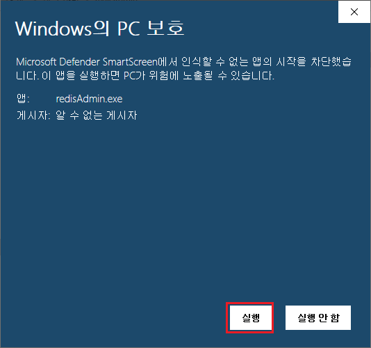 여기는 redisAdmin.exe로 처음 실행 시 뜨는 화면과 처리 방법에 대해서 설명합니다.