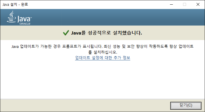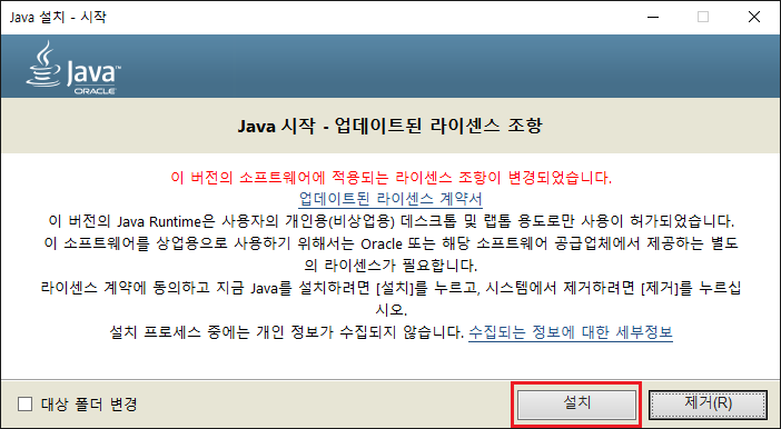 - Java 시작 - 업데이트된 라이센스 조항 -> [설치]를 클릭합니다.
