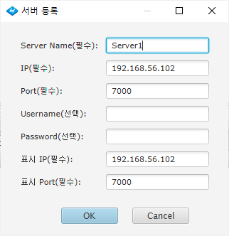 아래에 있는 표시 IP, Port는 기본적으로 입력한 IP, Port가 표시됩니다.