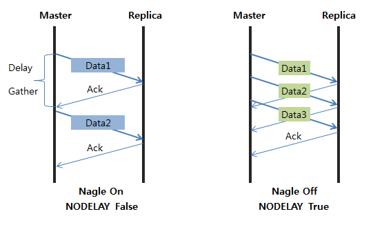 - yes: NODELAY False를 적용하는 것으로 데이터를 모아서 큰 패킷으로 전송합니다. 마스터와 복제 서버간 여러 네트워크 장비가 있는 경우 또는 대역폭(bandwidth)이 작고 원거리인 경우 유리할 수 있습니다. 리눅스 커널의 디폴트 구성을 사용할 경우 복제 서버로 데이터를 보내는데 최대 40ms의 지연이 발생할 수 있습니다.