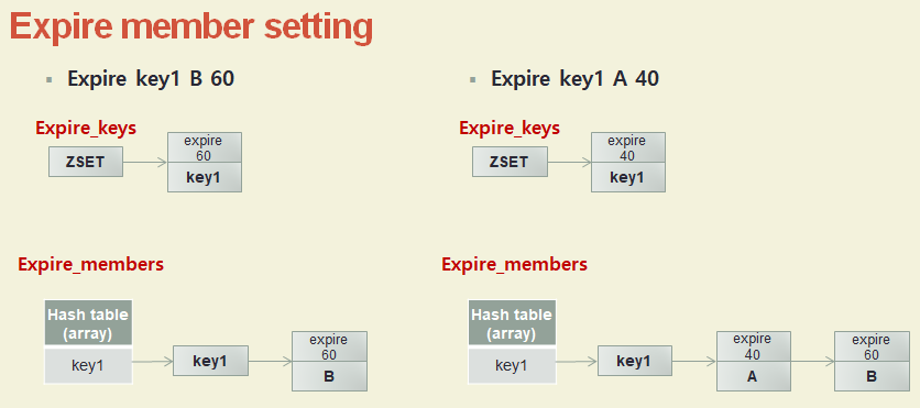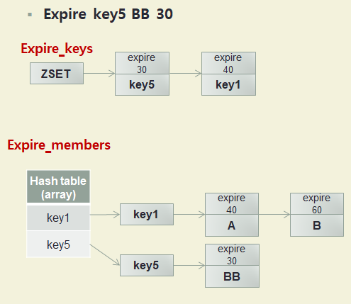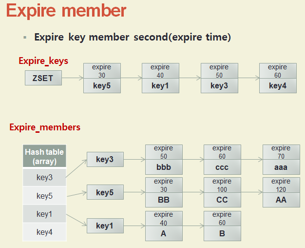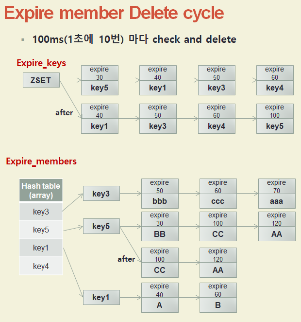 - Expire_keys는 Zset 구조를 사용하고, expire_members는 hash table과 zset을 사용합니다.
