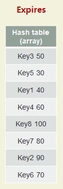 Expires는 Hash table이라고 하는 배열(array)에 저장됩니다. Hash table이라고 하는 이유는 hash 값으로 배열의 어느 위치에 할당되지 때문입니다. 따라서 일정한 순서가 없습니다.